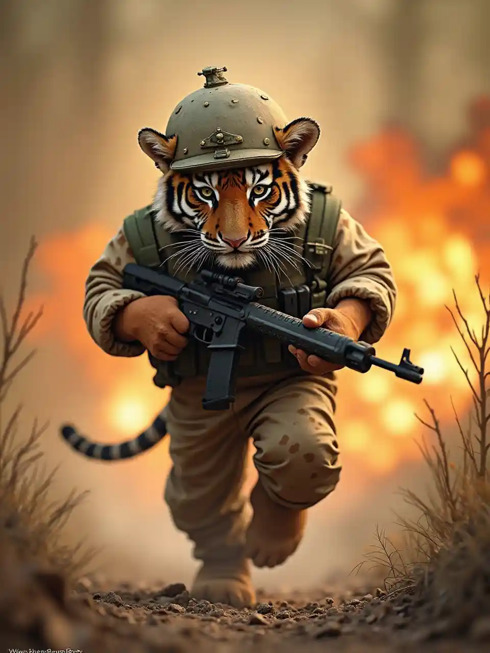 JocelynBir asker kıyafeti ve silahlı kaplan yavrusu, patlamadan kaçıyor