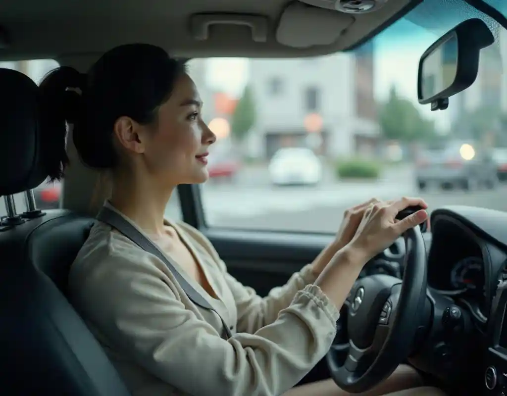 Olgun kadın, ultra yüksek kalite, 8k, fotorealistik, yalnız, araba kullanıyor:1.331, mutlu sür, Tokyo'nun merkezinde, izleyici onu görüyor