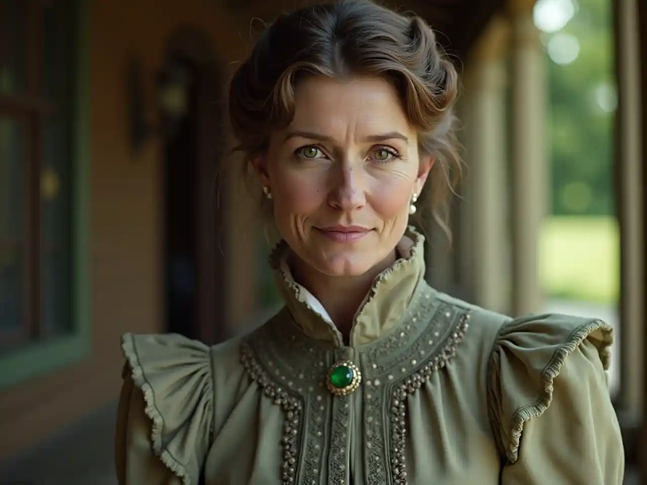 Sağlam ve zarif 69 yaşındaki bir bayan, gri çizgilerli kahverengi saç, Victoria dönemi saç modeli, koyu kahverengi gözler, yüksek yakalı, uzun kollu ve crinoline ile Victoria dönemi elbisesi, elbisenin yakasının ortasında zümrüt broş, mücevher, lüks bir çiftliğinin verandasında, 1854 yılında, açık yüz ifadeleri, Sinematik, 35mm lens, f/1.8, aksan aydınlatması, küresel aydınlatma -- v 4