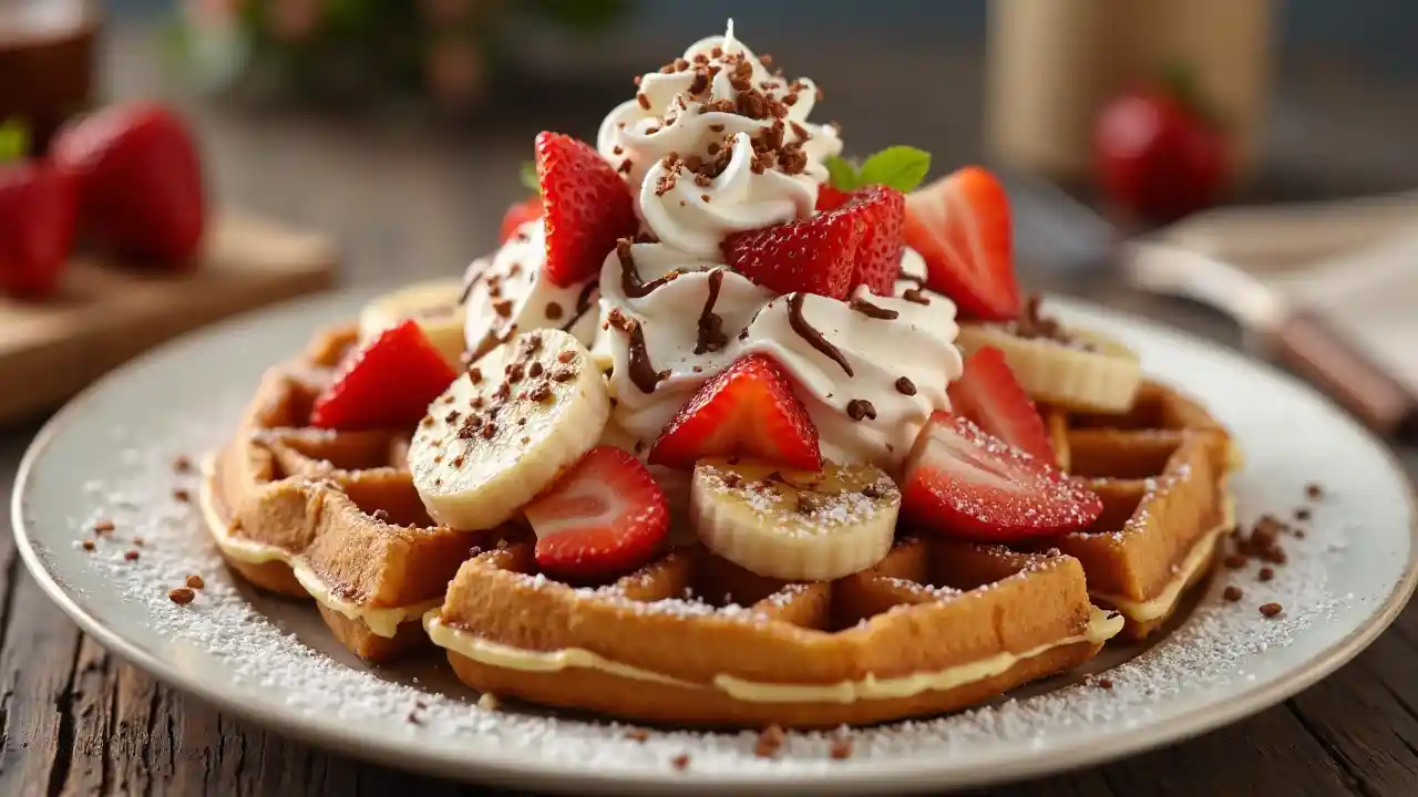 Çilek, muz, krem ve Nutella ile kaplanmış lezzetli vafeler