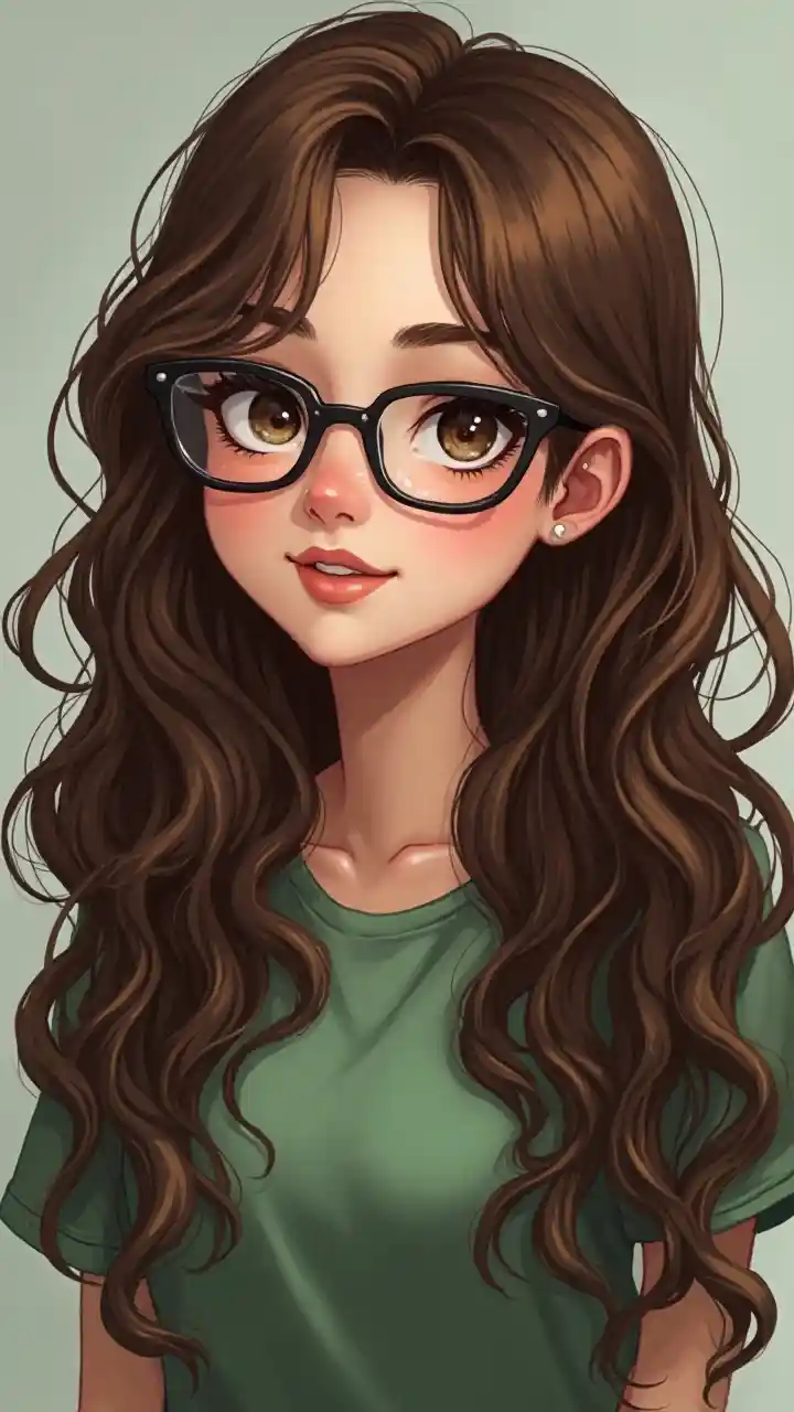 JaydenDalgalanmış kahverengi saçlı, gözlüğü hafif bronz, yeşil üstlü kız → 2b saç tipi