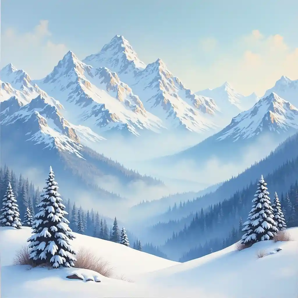 SavannahKarlı dağ manzarası, yağlı resim, karla kaplı zirveler, serin kış sahnesi, yüksek kalite, gerçekçi, serin tonlar, yumuşak ışık, huzurlu bir atmosfer