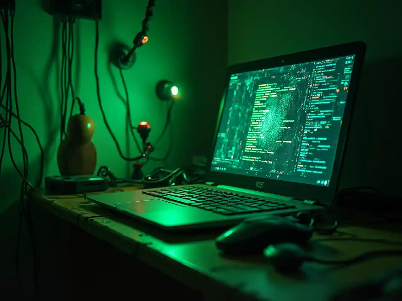 Eski oda, bir sürü yeşil LED kablo, eski ve bozuk bir dizüstü bilgisayar ekranı,