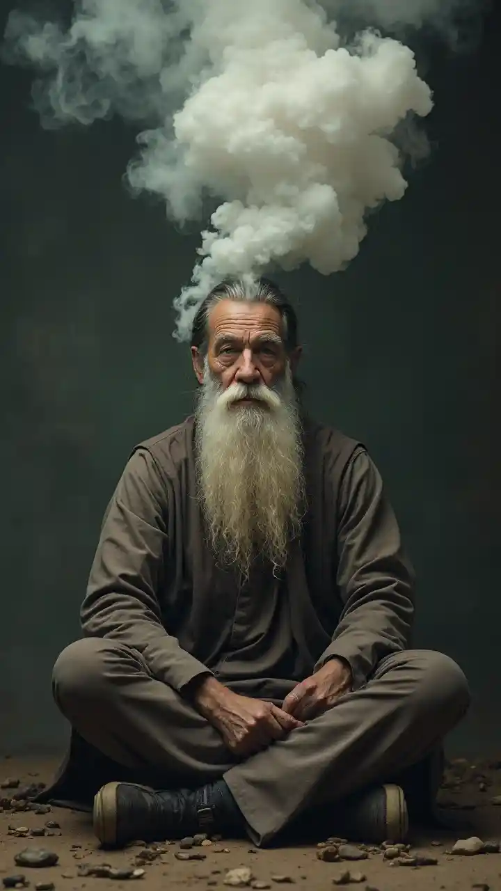 Uzun sakallı yaşlı bir büyücü, bacaklarını çapraz olarak oturmuş büyük bir pipet içiyordu. Üstünde kocaman bir duman bulutu vardı