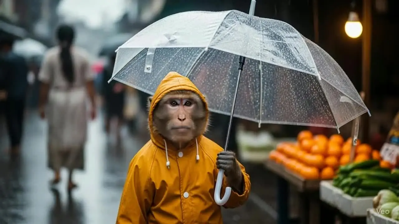 Canlı bir açık hava pazarının ortasında, parlak sarı bir yağmur paltosu giyen ve şeffaf bir şemsiye tutan garip bir maymun gösteriyi çalıyor. Yağmur hafifçe düşerken bu küçük tüylü oyuncu sahneye beklenmedik bir dönüş getiriyor. Yapay Zeka'nın büyüsüyle bu sevimli maymun, canlı ifadeleriyle şarkı sözlerini mükemmel bir şekilde taklit ederek, yakıcı bir melodiye dudaklarını senkronize etmeye başlar. Kaşların kaldırılması ve küstahça gülümsemeler, basit bir anı keyiflendiren bir gösteri haline getirir. Yağmurda şarkı söylese de, ya da yoldan geçenlerle oyun oynasa da bu büyüleyici karakter, herhangi bir videoyu keyiflendiren yapay zekâ'nın eğlenceli potansiyelini sergiliyor. Bu maymun yeni bulduğu ses yeteneğini gösterirken gülmeye hazır olun