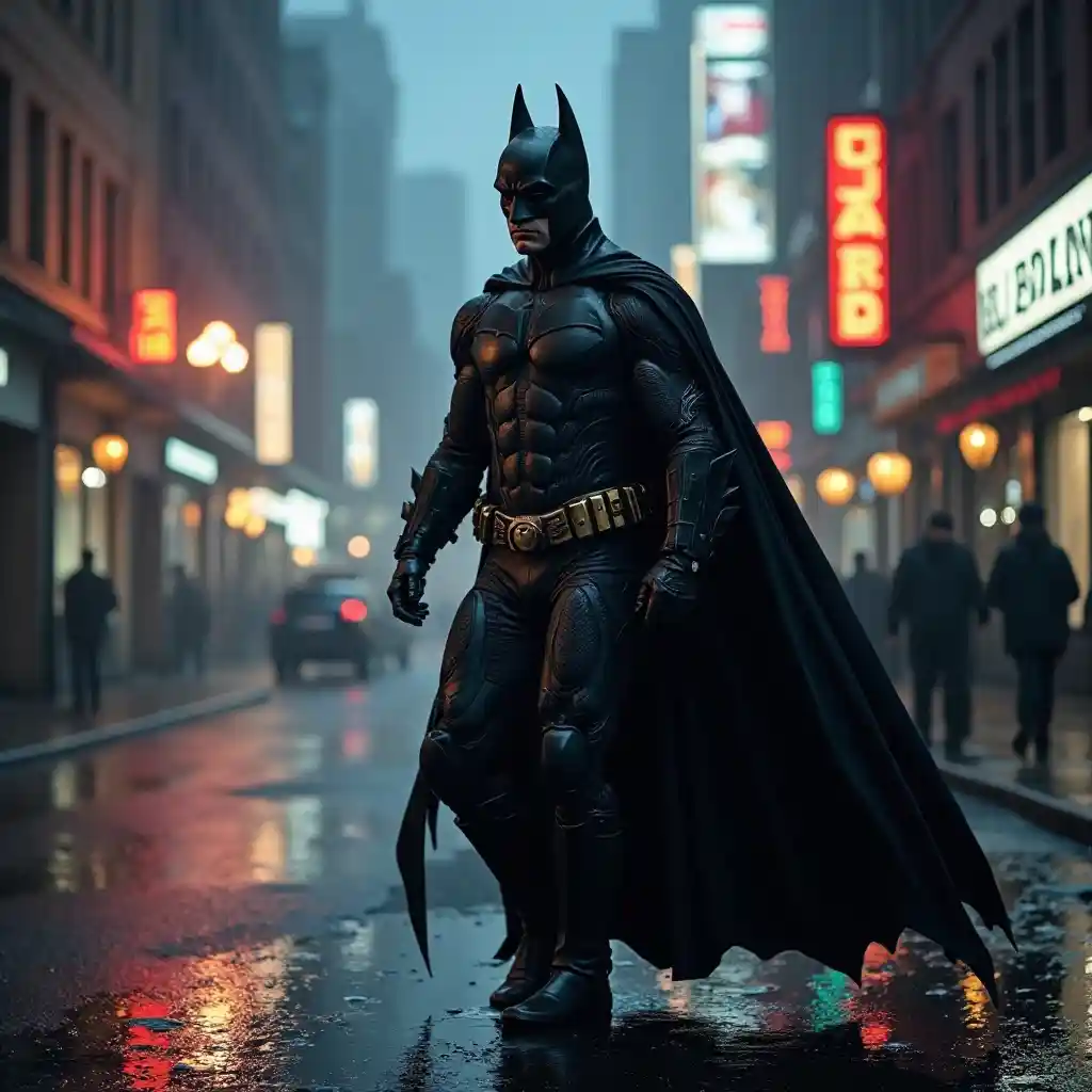 電影《銀翼殺手》背景中的蝙蝠俠在雨中行走