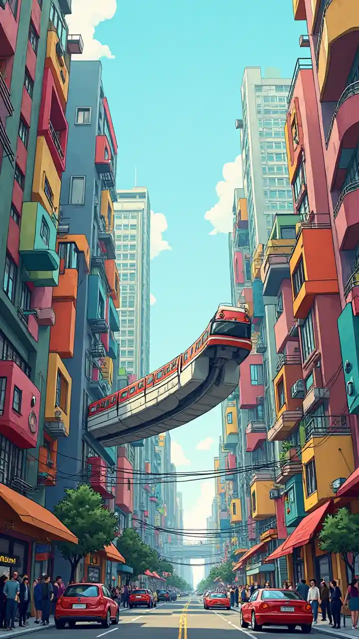 一座卡通現代化城市的城市街景,扭曲多彩的建築,懸浮的單軌電車,交通,人羣
