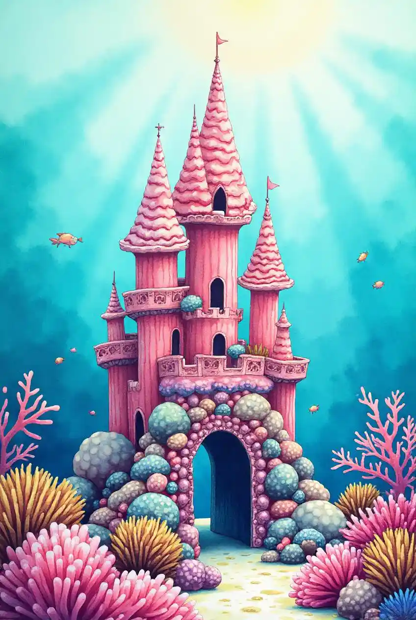 水彩畫用珊瑚做成的水下城堡,水是綠松石色的。城堡矗立在珊瑚礁上,那裏有五顏六色的息肉和游魚。而城堡本身有粉紅色的色調,看起來像貝殼和珊瑚