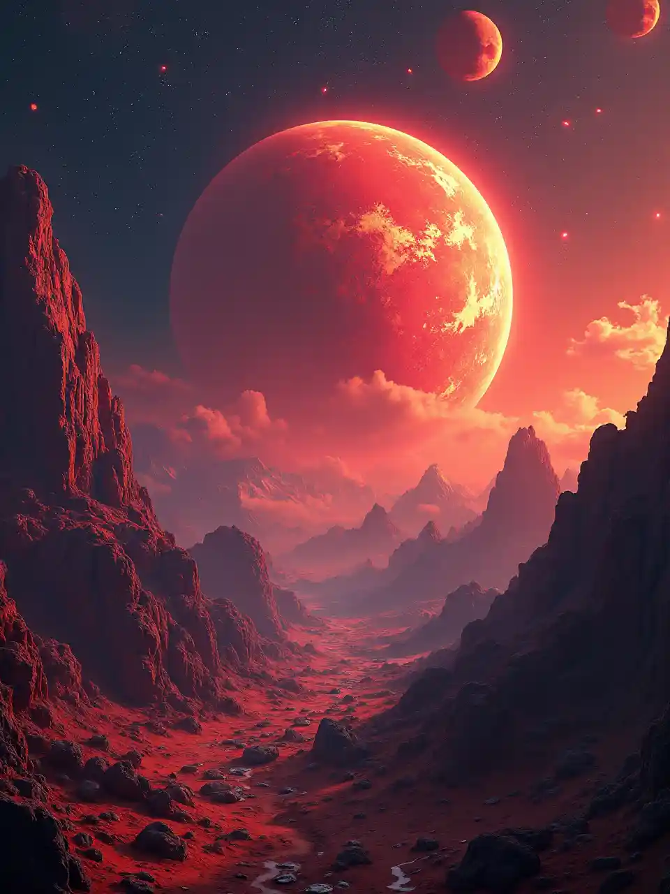 逼真的、(生機勃勃的)、色彩斑斕的、(多樣照明的)紅色星球,豐富的細節,發光的燈光照亮景觀,陰影的動態互動,妖嬈的氛圍,沉浸式的景深,浩瀚的星空背景,展現天象之美,超細緻、超現實卻又令人歎爲觀止的場景,宇宙探索美學