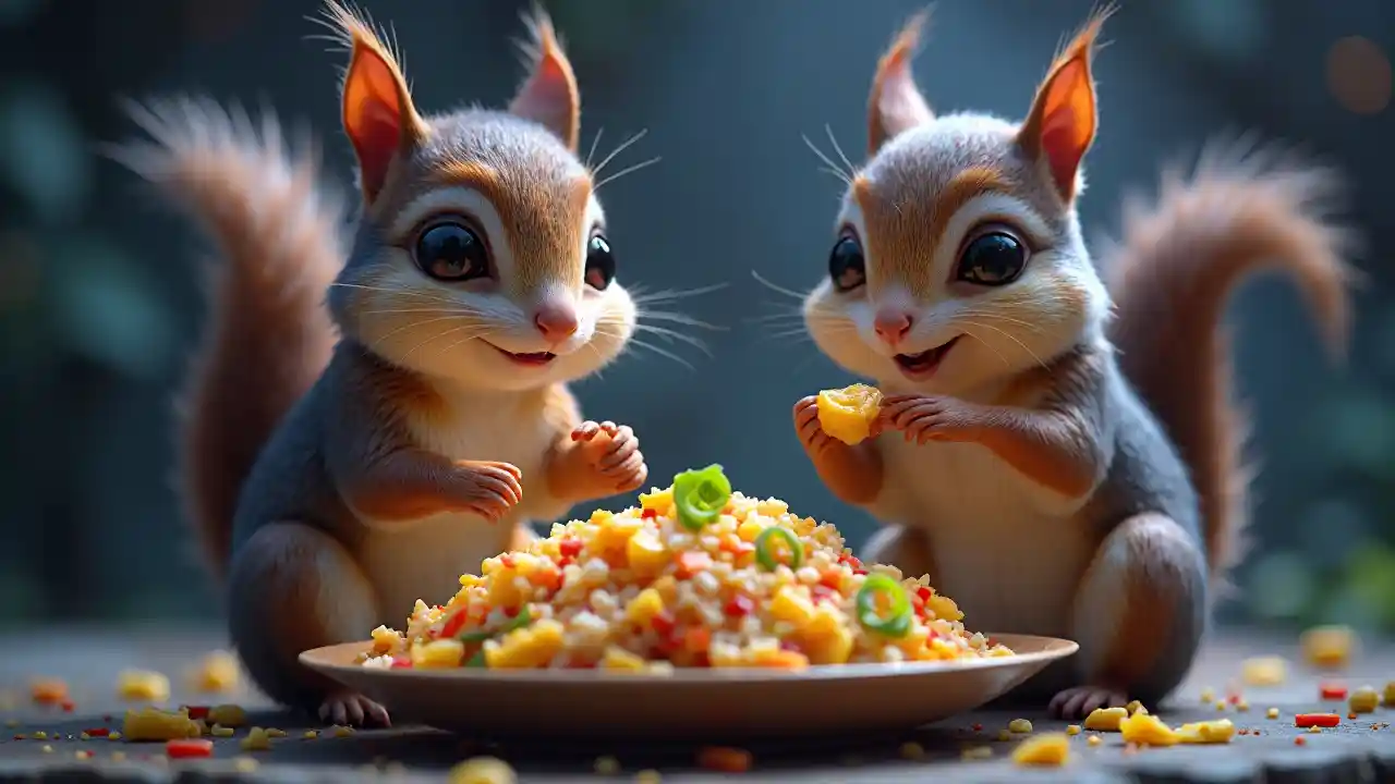人物以太超逼真未來派雄辯可愛可愛可愛小飛鼠帶着巨大的人類微笑和大而美麗的夢幻眼睛喫着分層米飯、糖醋雞、菠蘿塊、甜椒。頂上芝麻蔥花,坐在奇幻世界裏,深藍紫色閃閃發亮的色調背景,鏡頭耀斑,漫射燈光,奇幻,錯綜複雜,高度細節,栩栩如生,概念藝術