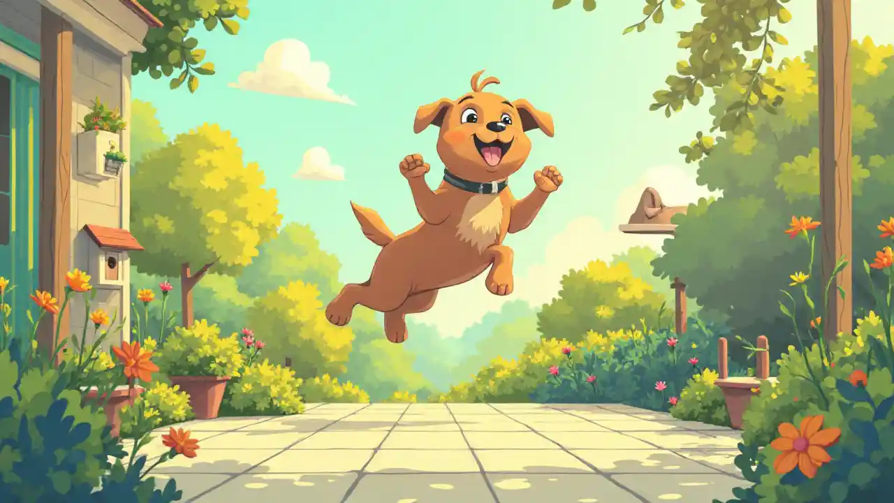 一隻可愛的棕色小狗在陽光明媚的綠色花園裏跳過露臺,花園裏種滿了鮮花和鳥舍。風格化的插圖。