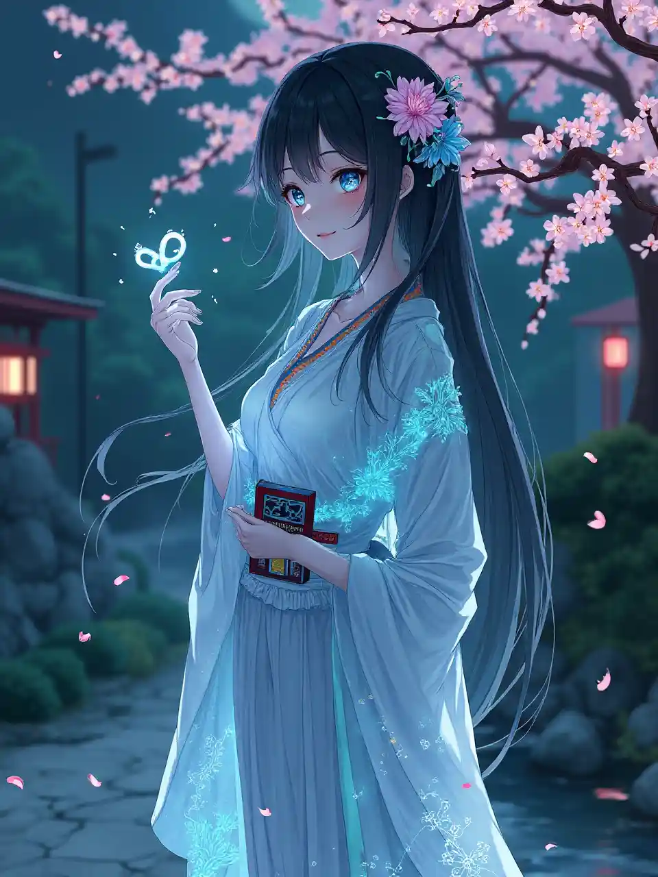 人形,半透明納米石皮,分形發光眼睛,旋轉粒子氣場,日本和服,開放式和服上衣,變形卷鬚手指,櫻花能量圈,櫻花髮夾,純白皮膚,烏黑長髮配水藍色花邊,燈光寵物,安卓手機,kaiju,武士刀,站在大理石露臺上,月光照明,雍容、端莊、溫柔的微笑,螢火蟲與納米石交融,雜草叢生的夜園背景,印有「HIRO」標誌的飲料盒,櫻花樹,小溪,陰森的寧靜,空靈的賽博朋克氛圍,高度細節的半透明光線,電影般的陰影,高動態範圍,縈繞想象,側視,斜視,動態視圖,霓虹燈重點照明, (中性照明:1.1),低光,影院照明,高度細節,動漫寫實,高對比度,高度細節,焦點銳利,景深,光線追蹤,最佳照明,細節背景,電影構圖,美麗的臉龐,美麗的眼睛,景深,動漫寫實, score _ 9,score _ 8 _ up,score _ 7 _ up,sharp focus,(masterpiece:1.2),(quality best:1.2),(very beautiful:1.2),(absurdres:1.2),(detailed background),perfect anatomy,scenery,dynamic poses,bright colors,detailed shadows,night bar background,impressionist painting,high det