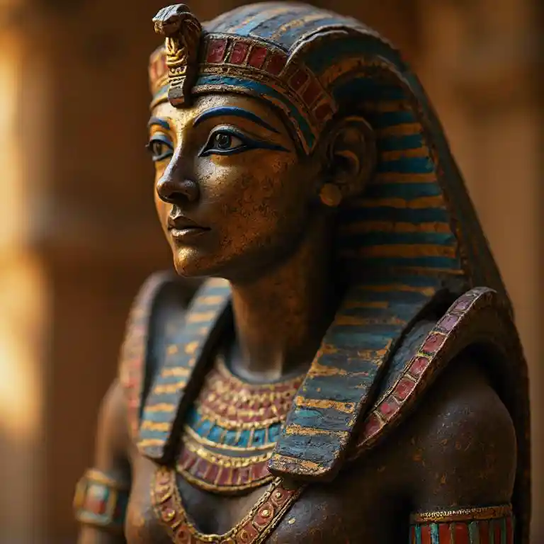 古埃及雕像裝飾着生機勃勃、色彩斑斕的珠寶,從柔和發光的背景中緩緩旋轉着閃爍的陰影,特寫鏡頭輕輕平移