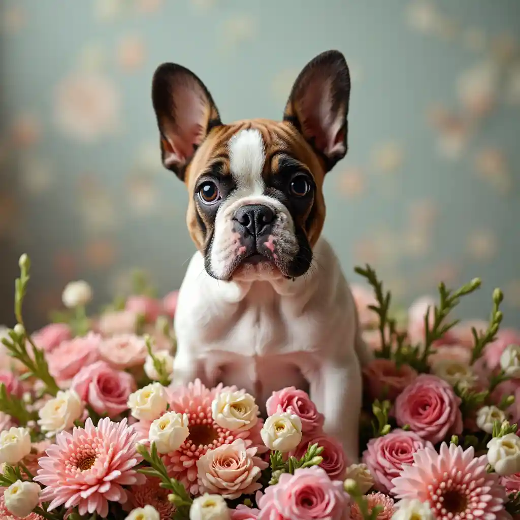 法國鬥牛犬花卉花堆寵物攝影庫存照片概念藝術寫實動物肖像大自然啓發異想天開的構圖