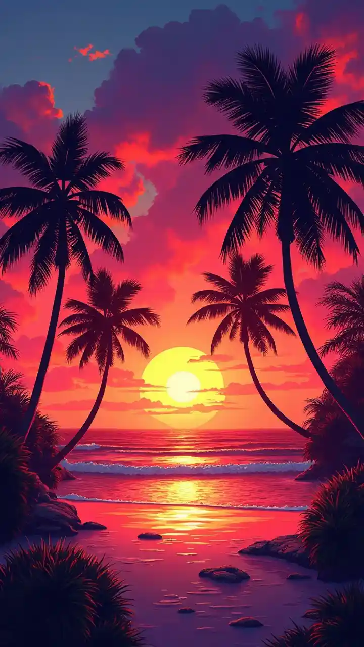 佛羅里達日落,棕櫚樹着火,霓虹燈鮮豔的色彩,