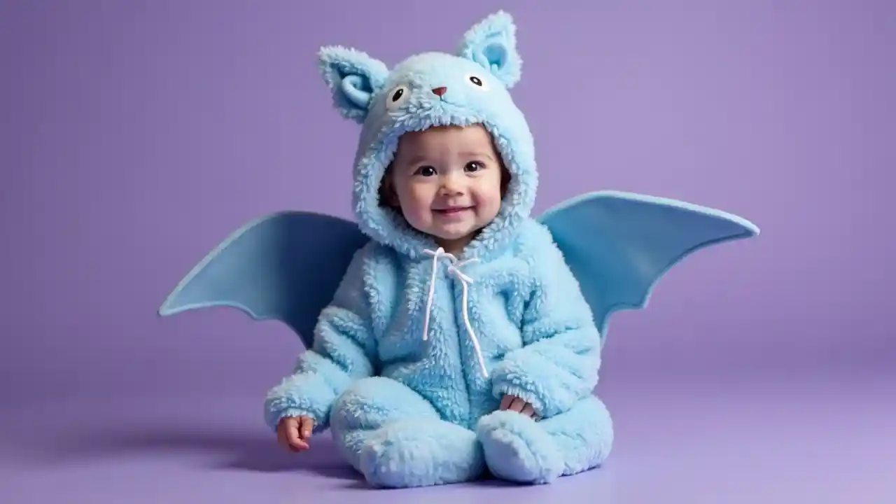 孩子穿着帶翅膀的淺藍色毛茸茸的蝙蝠/貓服裝,坐在紫色的背景上。