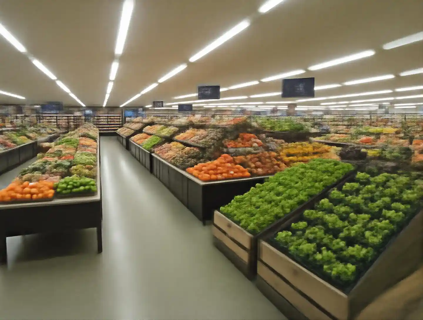 圖片顯示的是一家室內雜貨店,在熒光燈的照射下,一條條新鮮農產品的過道。
