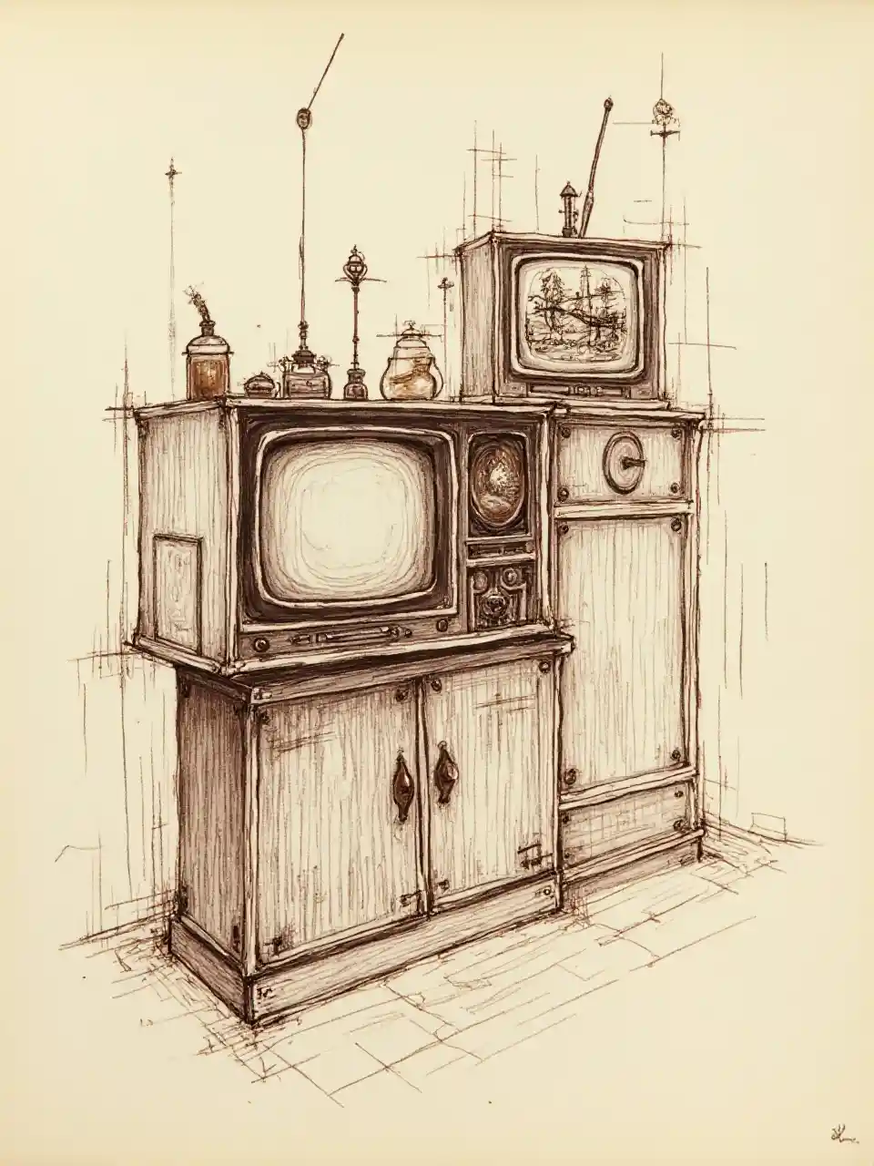 Hassan kamel al sabbah正在研究的電視和馬達多相多環靜態轉換器的棕色墨水紙上舊手繪圖