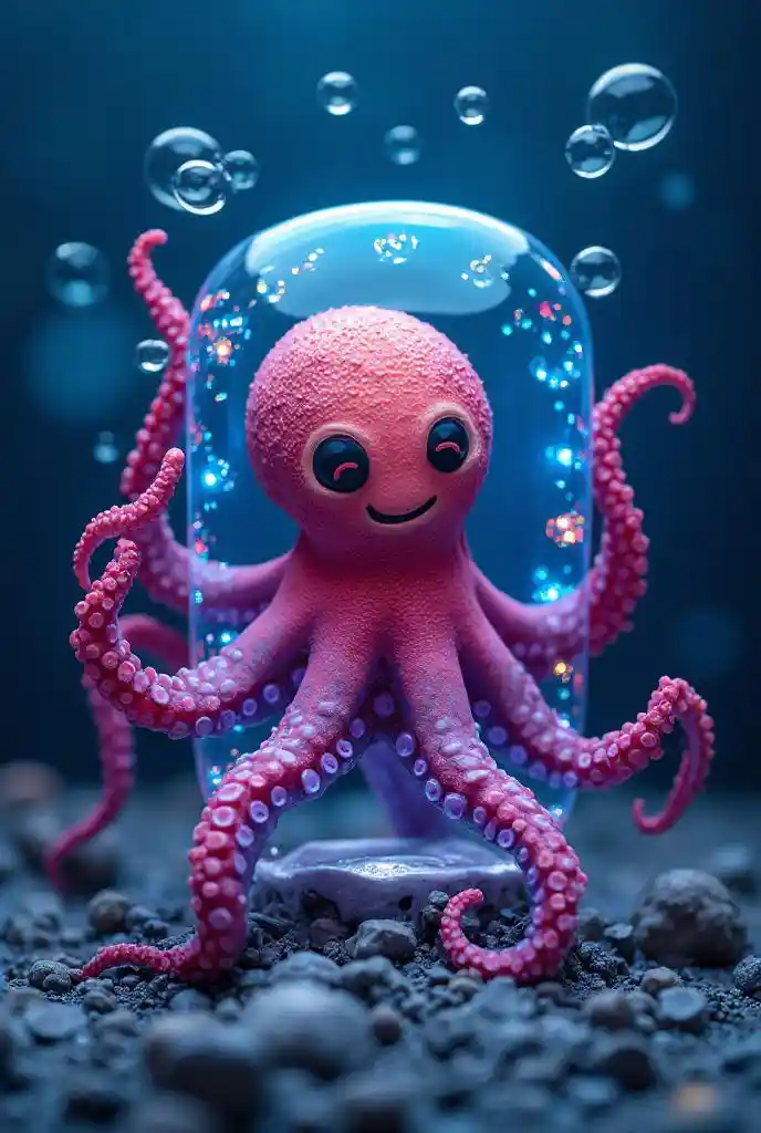 一隻有着紅色和紫色友好面孔的章魚,手裏拿着一個水晶邊框,周圍有LED,上面有SeaArt.AI的標誌。 被幾個帶有i的氣泡包圍着