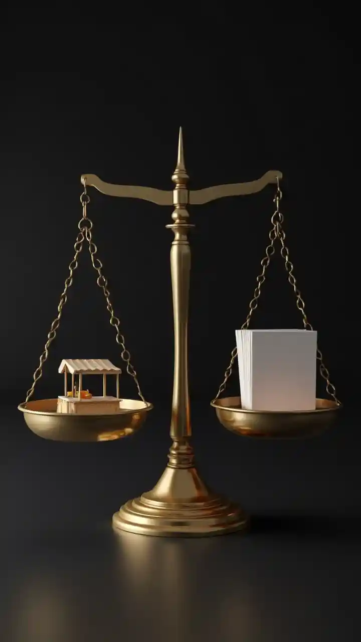 做一個金色的法律刻度的形象。一個碗裏的秤上放着一個小玩具攤,另一個碗上放着一包文件。這一切都是在黑色背景下進行的。圖像質量應該像一張高分辨率的照片或者像一個具有高質量渲染的3D模型。