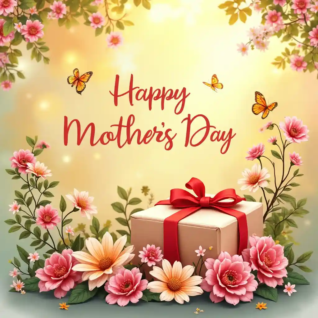 利用柔和的粉色、柔和的黃色、鬱鬱蔥蔥的綠色等豐富、陽光充足的調色板,打造充滿活力、散發溫暖與親情的母親節卡片設計。現場包括一件包裝精美的禮物,上面裝飾着一條火紅的絲帶,依偎在一束盛開的花朵之間,比如雛菊和玫瑰,象徵着愛和欣賞。背景中,一束束金色的陽光透過枝繁葉茂的枝條,投下溫柔的光芒,突顯出卡片的暖心訊息『母親節快樂』。文字文筆典雅,傳遞溫柔與喜悅。融入瞭如蝴蝶在附近飛舞的元素,增添了一絲奇思妙想,而整體構圖則散發出懷舊、誘人的氛圍,讓人想起珍愛的家庭時刻。爲個人風格建議一種夢幻的水彩插畫風格。