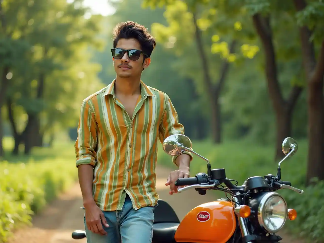 自信地站在一輛朝氣蓬勃的橙色摩托車旁,一位年輕人穿着一件大膽的綠白條紋襯衫,散發出俏皮的能量,配上他的棱角分明的太陽鏡,映照出周圍的綠意。他光滑的後背髮型和內省的表情增添了一絲酷炫的精緻,他隨意地靠在自行車上,手擱在車架上。背景是鬱鬱蔥蔥、陽光斑駁的景觀,樹木林立,營造出一種寧靜和冒險的感覺。溫暖的燈光增強了場景的自然美感,營造出一種既輕鬆又誘人的氛圍,彷彿他已經準備好悠閒地穿越大自然。