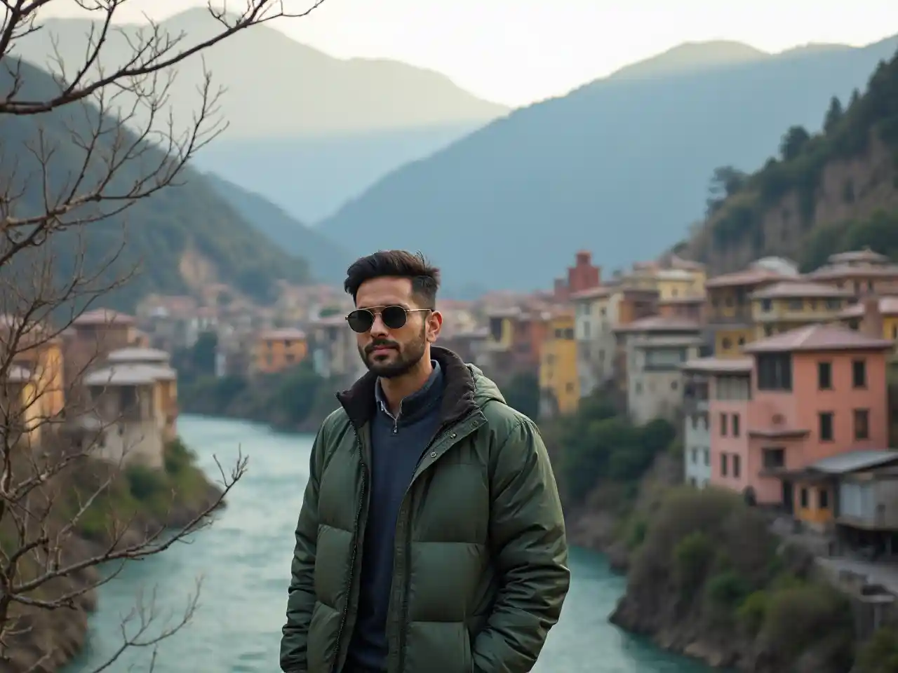 在連綿起伏的羣山映襯下,一名男子自信地站着,身穿綠色羽絨服,戴着墨鏡,一臉安詳。場景在風景如畫的濱河小鎮展開,斑斕的建築依偎在山坡上,穿插着歷史悠久的寺廟。陽光在景觀上投下溫柔的光芒,露出下面流淌的河流,與周圍建築的生機勃勃的色調相得益彰。無葉樹枝框住前景,爲構圖增添深度。整體情緒傳遞出對該地區自然和文化之美的寧靜和欣賞之感。