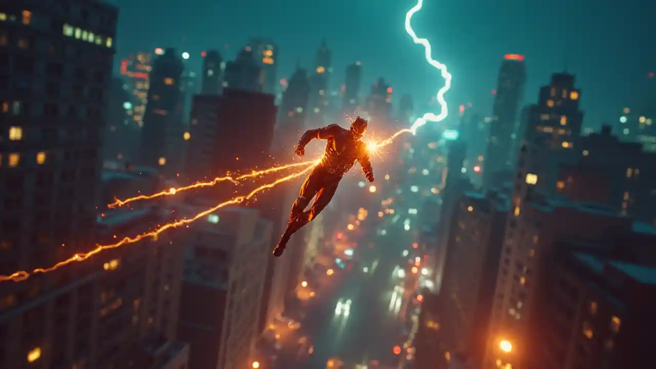 超級英雄在夜間從外星人的威脅中拯救了這座城市。他飛過建築物飛向天空,用從他眼睛裏連續流出的等離子放射性螺栓摧毀入侵者,並在戰鬥中失去了暴露他軀幹的部分西裝