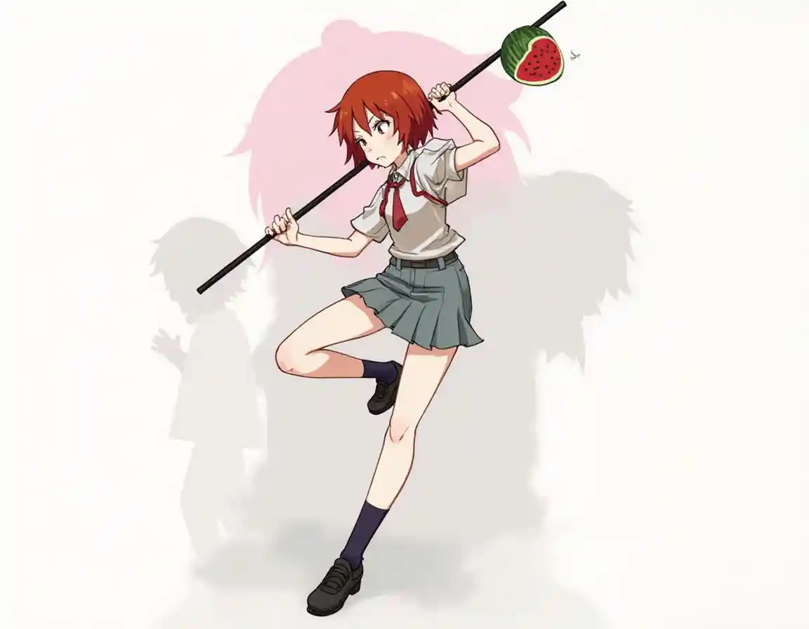 Nora Valkyrie,RWBY,校服,手持杆子,末端有西瓜,打鬥姿勢,簡單背景