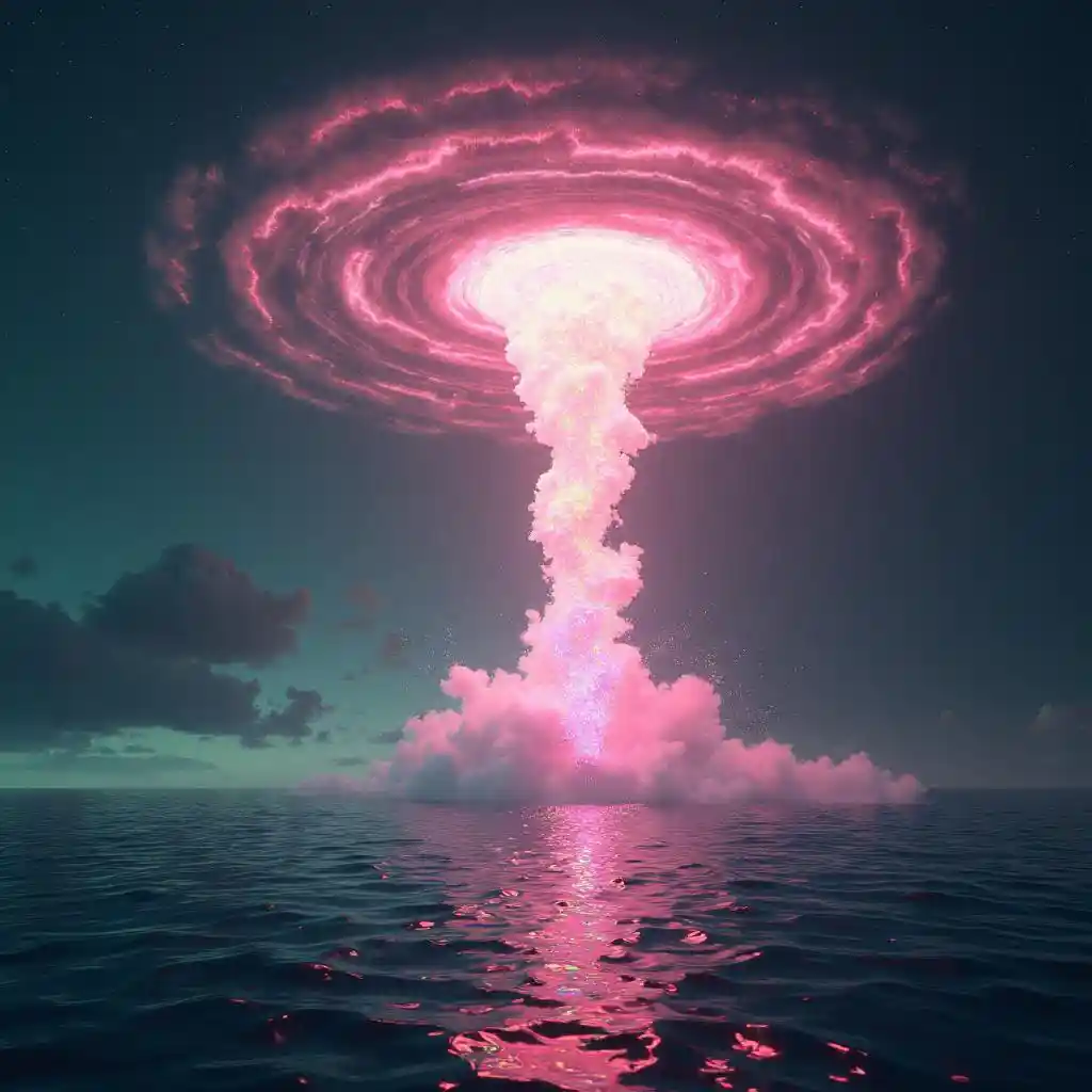 8K、超逼真的場景,酷似高成本科幻電影。一股高聳的旋渦、發光的粉紅色風從平靜的海洋中戲劇性地升起,粉紅色的渦旋與耀眼的綠色和藍色閃光顆粒交織在一起,以超凡脫俗的光芒閃爍和脈動。海面反射出低垂的金色太陽發出的柔和、光芒四射的光芒,創造出令人歎爲觀止的色彩相互作用。上方,天空是一片深邃的宇宙黑色,點綴着看起來幾乎是有形的明亮星星,增強了場景的超現實而又栩栩如生的品質。超詳細的環境給人的感覺是廣闊的、電影化的,每一種質感——從波光粼粼的大海到龍捲風的微光——都以令人難以置信的現實主義渲染