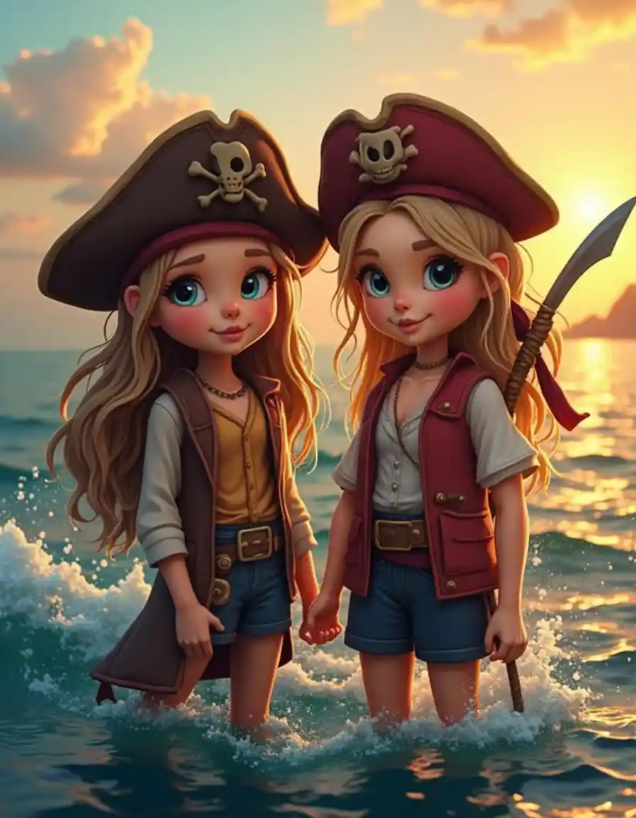 2個可愛的海盜女孩,高清,逼真,圖片,人像,4K分辨率,細節極致,色彩鮮豔,散景效果類似,自然光,海洋背景,波浪,日落,c
