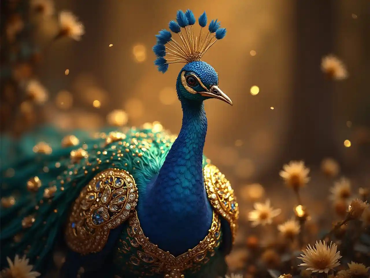 神奇的王孔雀戴着昂貴的珠寶那是華麗的,令人難以置信的細節,錯綜複雜,在發光的閃閃發光的珍貴夜光金上配上璀璨明亮的閃閃發光的閃閃發光的鑽石,皇家豐富的奢華