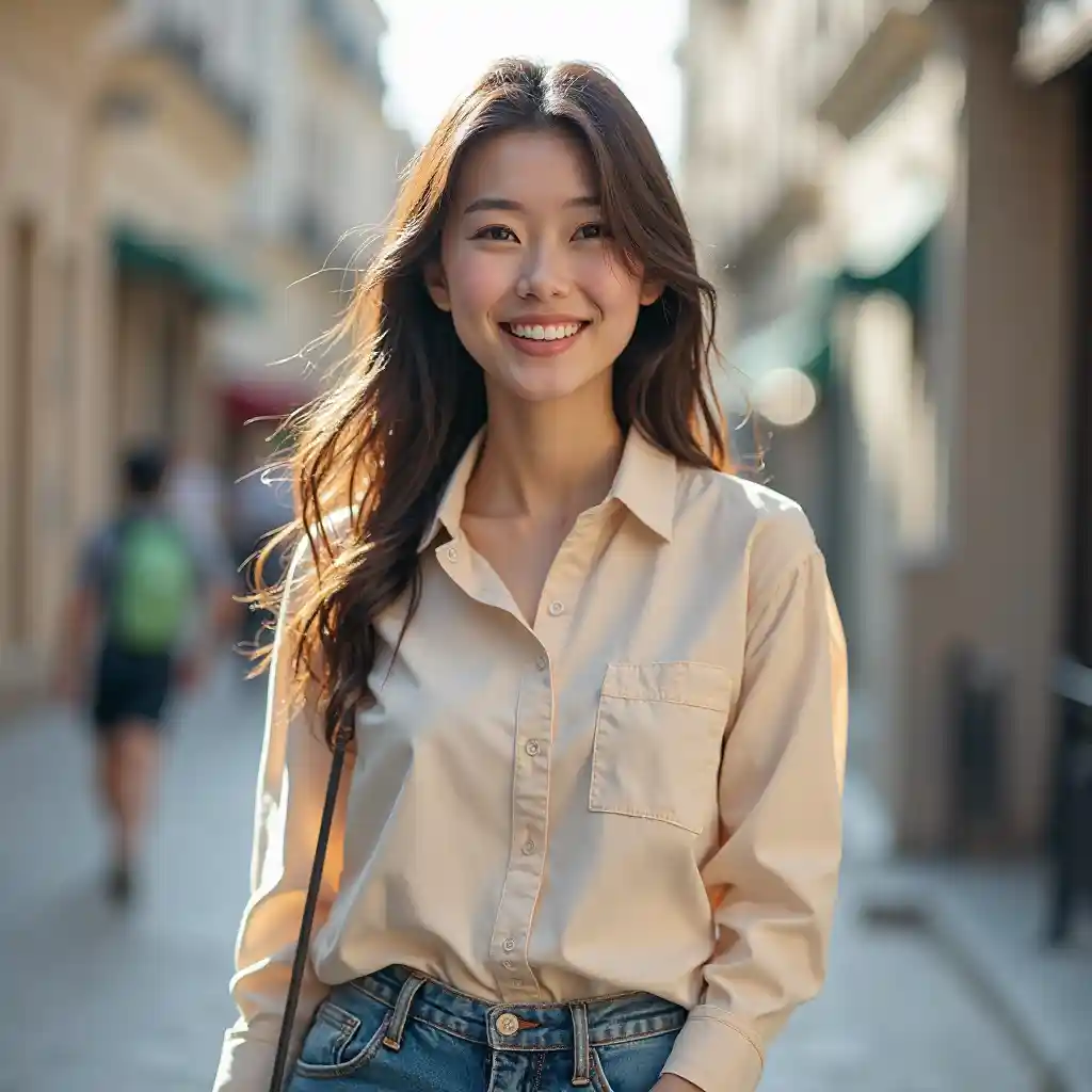 亞洲女孩身材豐滿笑容美豔,29歲女孩襯衫腰色米色在城市