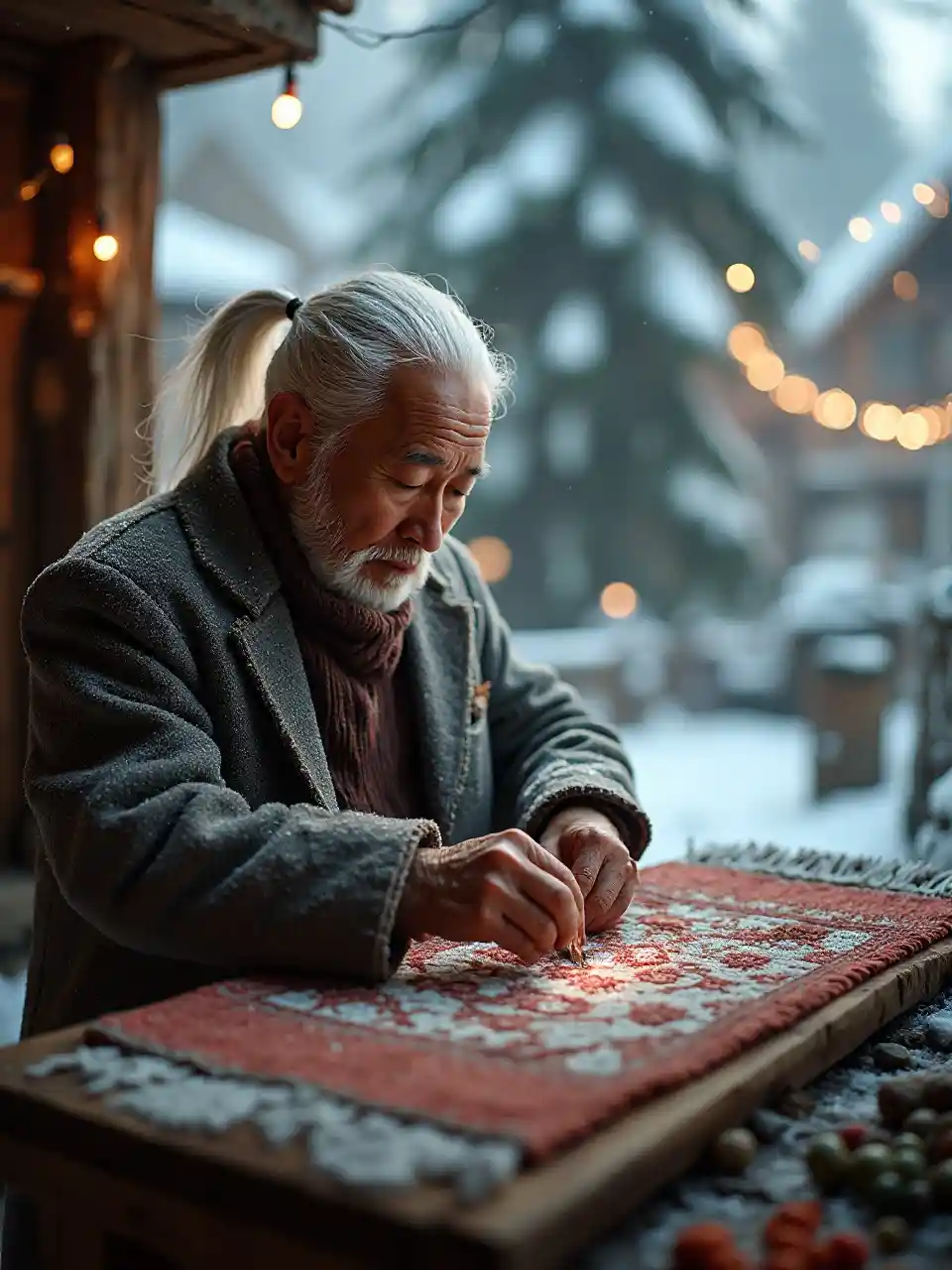在白雪皚皚的村莊裏織錦,一位75歲的亞裔男子,扎着白色馬尾辮,穿着一件雪花刺繡的大衣。閃爍的燈光和結霜的松樹框住了他,他靈活的手指在舒適、冬日的環境中散發着技巧和溫暖。他鎮定自若的神態撫平了寒氣。