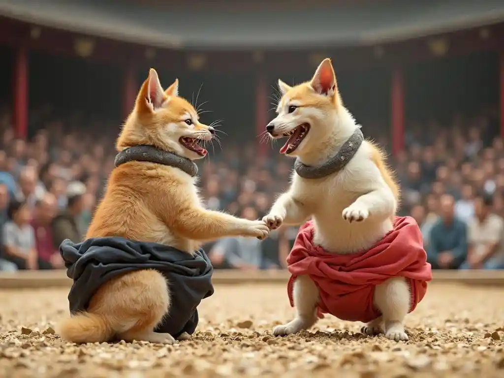hyper _ reality _ bilde,很可愛的狗狗和貓咪玩相撲_換人,他們在日本的擂臺上穿着fundoshi,很多觀衆都在歡呼,完美的dy