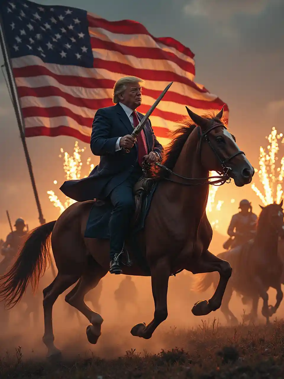 唐納德特朗普在一場激烈的戰鬥中騎在馬背上,右手拿着劍,在背景中用煙火帶領衝鋒美國國旗