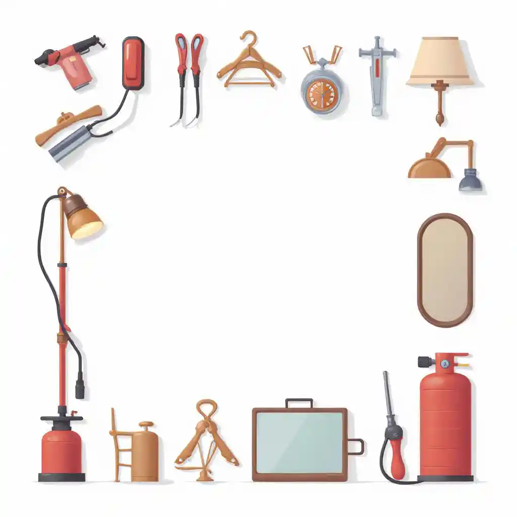 我需要你創建一個白色背景,並在上面放置『耳機、捲髮棒、燈具、鏡子、衣架、氣瓶、園藝工具』之類的東西你可能不會使用所有這些物品,但至少可以從這個列表中選擇4個。將它們顯示在白色背景上,但要使這些對象看起來像矢量圖像。有些矢量對象會是# 262626,有些會是# d2b48c 另外,要確保這些物品間隔均勻,大小一般。這樣一個物體不會佔據整個背景的四分之一,也不會太小。 只是別多選兩種顏色,顏色一定是這些『# 262626和# d2b48c』