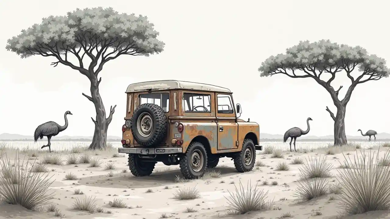 鏽跡斑斑的老古系列3在寬闊的非洲平原上的陸虎。相思樹。距離上的鴕鳥。輪胎揚塵。黑與白。拉爾夫·斯蒂德曼奇聞趣事風格圖解。