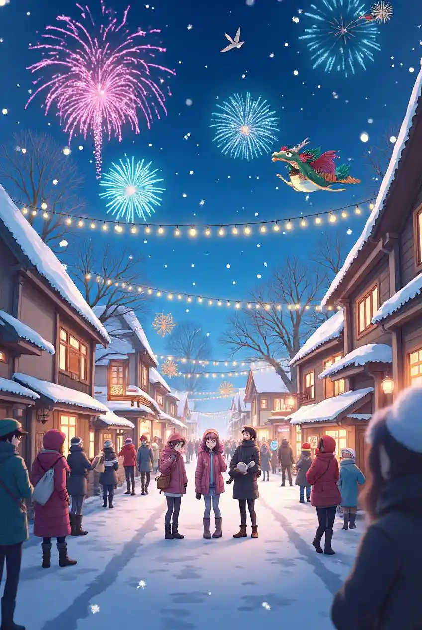 海濱小鎮的冬季節日,煙火龍游行,以喜慶的動漫風格。