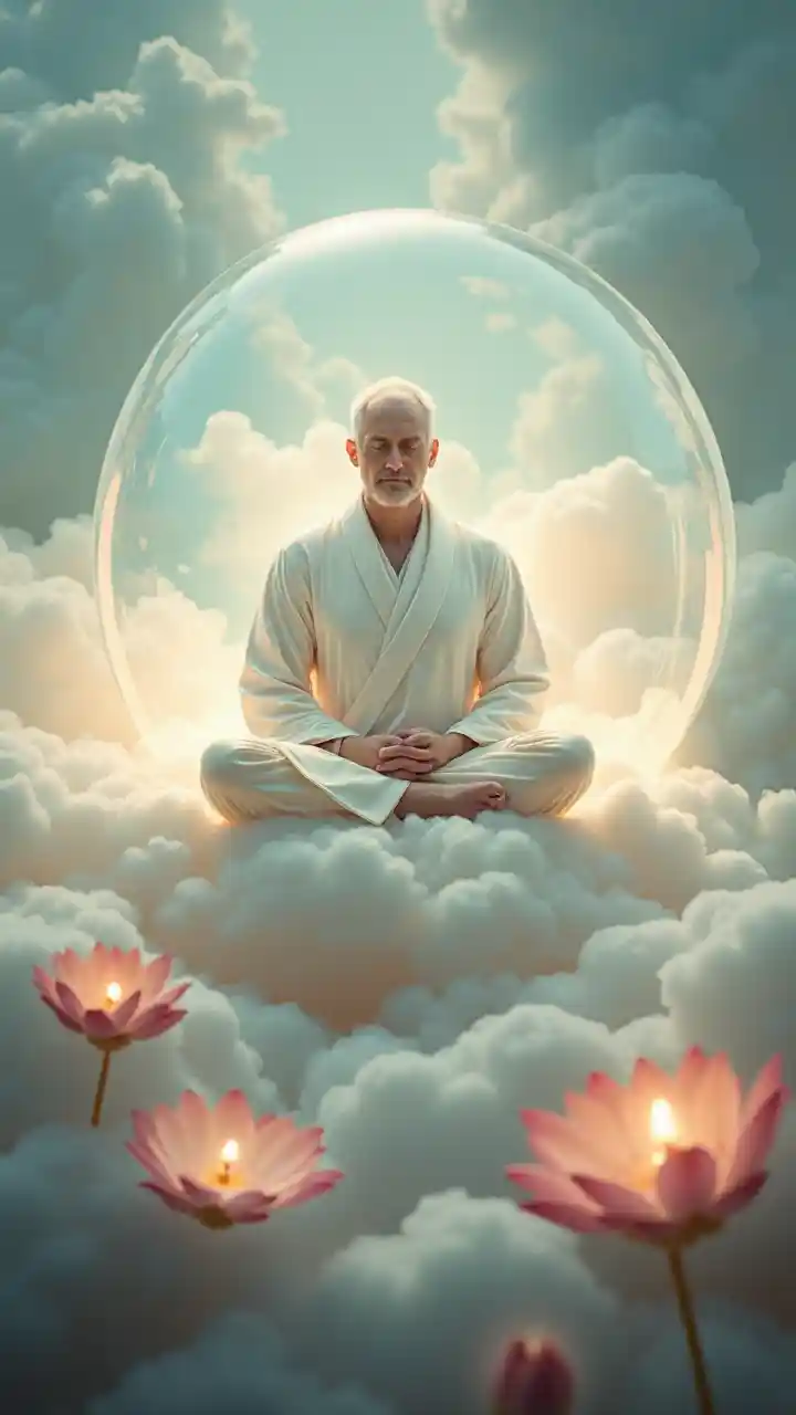 在漂浮的禪珠中冥想,一位40多歲的白人穿着絲質長袍發光。雲朵荷花開框定了他,他的寧靜沉穩的呼吸在未來主義、空靈的環境中散發着精神的深度和安詳的力量。