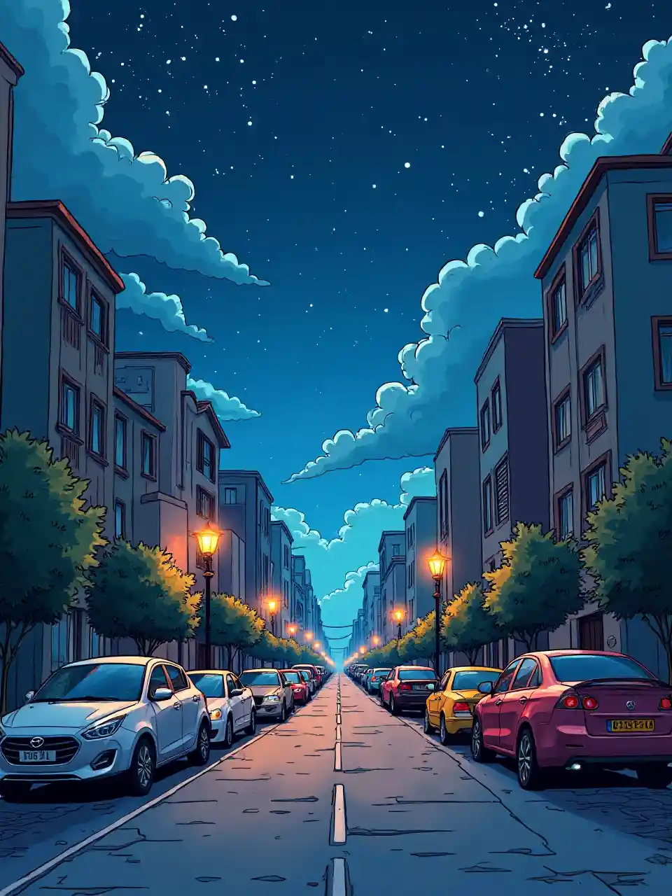 ایک گلی جس کے دونوں اطراف کاریں کھڑی ہیں اور اس کے اوپر ستاروں سے بھرا ہوا آسمان اور عمارتیں، آصف حنوک، خلائی فن، رات کا آسمان، ایک مزاحیہ کتاب پینل