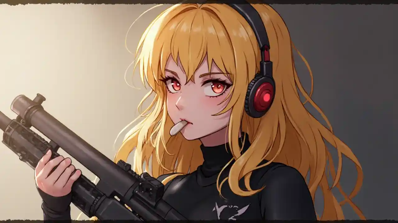 (ممتاز، بہترین معیار، absurdres، highres) ، حیرت انگیز معیار، بہت جمالیاتی، حجم کی روشنی، ڈیجیٹل آرٹ سٹائل، ڈرائنگ جمالیاتی، تصور پینٹنگ، انتہائی اعلی کی وضاحت یا شاہکار، بہترین معیار، absurdres، highres، انتہائی اعلی تفصیل، ڈیجیٹل آرٹ سٹائل، ڈرائنگ جمالیاتی، تصور پینٹنگ) morimee_style، پیاری چہرہ. 1girl، سولو، لمبے بال، ناظر کو دیکھ، سنہری پیلے بال، ہولڈنگ، سرخ آنکھیں، جسم کے اوپر، ہتھیار، ہولڈنگ ہتھیار، بندوق، سیاہ turtleneck، سرخ ہیڈ فون، ہولڈنگ سپر رائفل، ٹر نظم، سپر رائفل، سیاہ l96A1 سپر رائفل، منہ میں للی