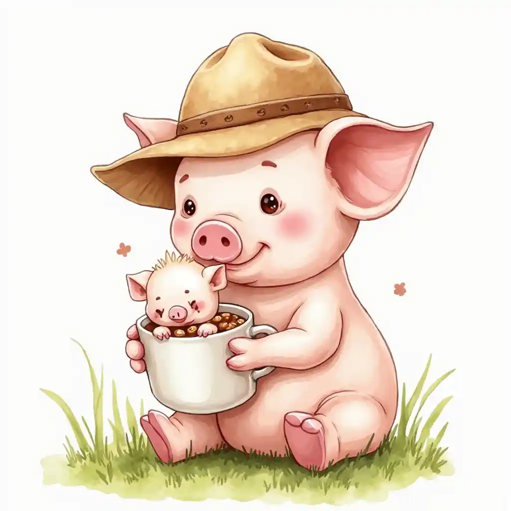 ایک خنزیر کا ایک پیارا آبی رنگ کا خاکہ جو تنکے کی ٹوپی پہنے ہوئے ہے، گھاس پر بیٹھا ہے، ایک ٹھنڈا کافی کے ساتھ ایک بچہ ہے.