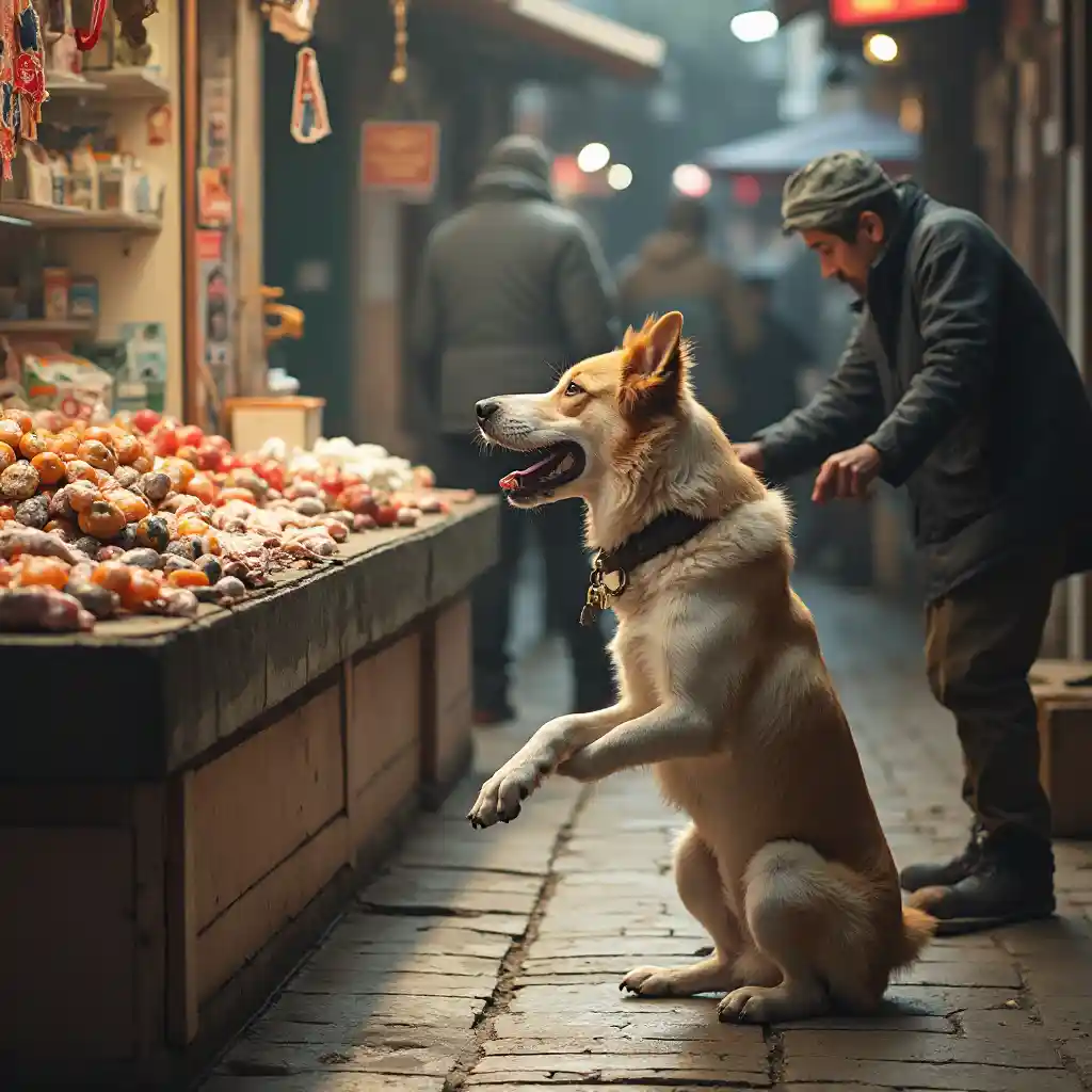 کتا مچھلی فروش سے ہڈی چوری کر رہا ہے۔