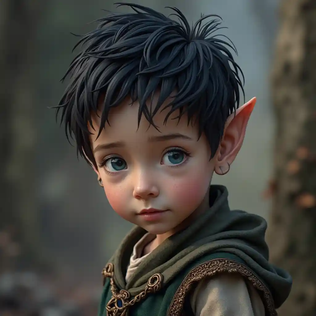 چھوٹا لڑکا، سیاہ مختصر گندا بالوں کے ساتھ elf کے کانوں اور قرون وسطی کے کپڑے میں نیلی آنکھیں