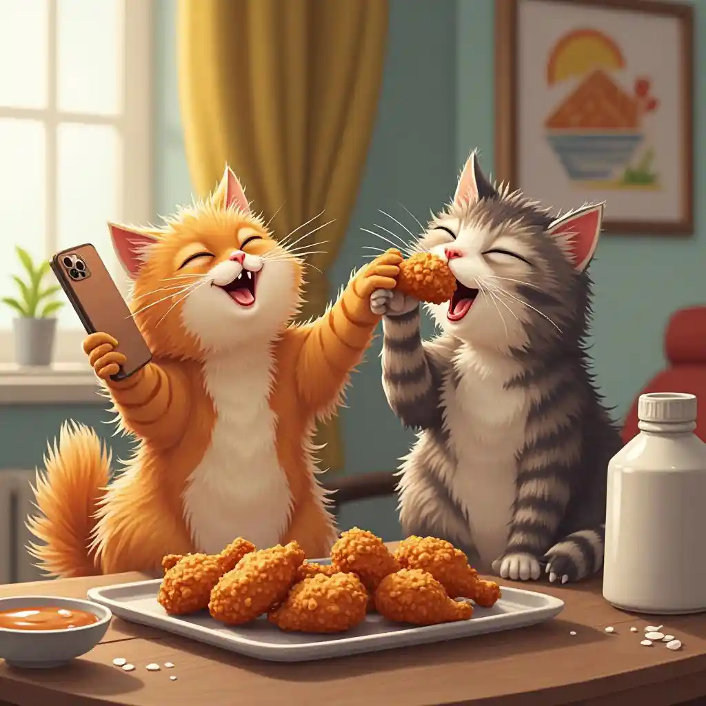 ایک اندرونی ترتیب میں دو بلیوں. ایک بلی، جس کی رنگت نارنجی رنگ کی ہے، اپنے ہاتھ کو اسمارٹ فون کے لیے پھیرا ہوا ہے، اور ایسا لگتا ہے کہ وہ سی فو فو کر رہی ہے۔ دوسری بلی، جس کی بھوری اور بھوری رنگ کی کھالیں ہیں، وہ تند خوزی سے ایک ٹکڑا بھنا ہوا مرغی کھا رہی ہے۔ ہنس ڈاریاس ایل ان کے سامنے ایک ٹرے ہے جس میں تلی ہوئی چکن کے ٹکڑے ہیں۔ میز پر ایک ڈپ چٹنی اور ایک سفید کنٹینر، ممکنہ طور پر ایک دودھ کا کٹورا بھی ہے. پیچھے ایک ونڈو، پردے، KFried Chicken Hans D سے framed تصویر ہے