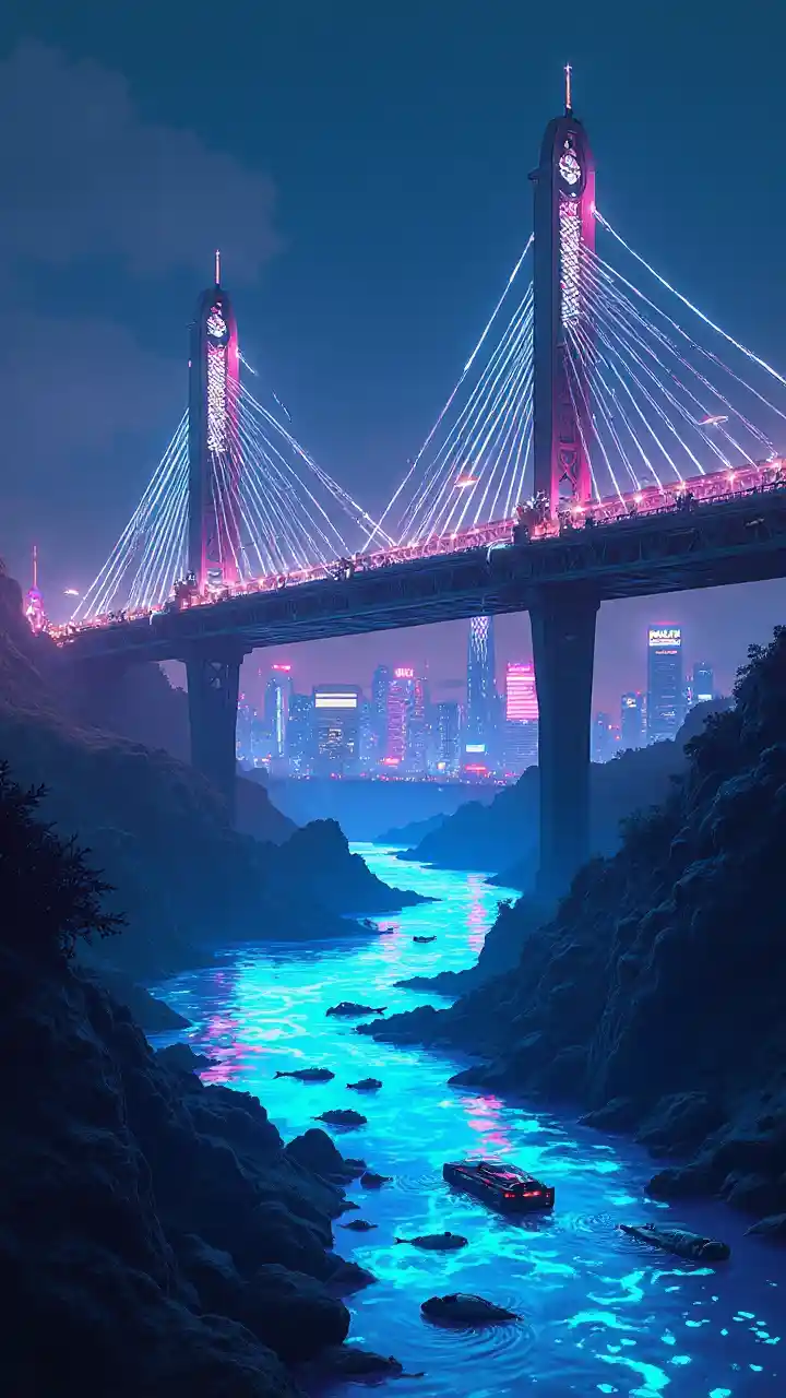 ایک خوبصورت، نیون روشن معلق پل، جس کا ہوا بازی کا سلوٹ رات کے آسمان میں سے گزرتا ہے، چمکتا، چمکتا دریا پر محیط ہے، جہاں حیاتیاتی مچھلی اور عجیب، آبی مخلوقیں پھینکتی ہیں اور ایک دوسرے کو جوڑتی ہیں، ایک غیر معمولی چمکتی ہیں. ہلکی، ہائی ٹیک گاڑیاں، جن کے چیسس ہولوگرافک لہجے سے آراستہ ہیں، پل کی سطح پر رفتار، ان کے پیچھے روشنی کے راستے. خود پل پیچیدہ، جیومیٹری پیٹرن اور ہولوگرافک اشتہارات کا ایک ٹیپ ہے، ایک متحرک، سائبرپک توانائی کے ساتھ نبض، نیچے dystopian شہر کی عکاسی. ایش تھورپ کی مستقبل کی طرز پر، سڈ میڈ کی صنعتی ہموار، اور ایچ آر گیجر کی تاریک، بائیو مکینیکل غیر حقیقی، ماسمون شیرو کی ہائی ٹیک صوفیانہ کی ایک جھلک کے ساتھ، یہ منظر ایک جادو، نیون سے بھرا ہوا خواب ہے، جہاں ٹیکنالوجی اور فطرت روشنی اور آواز کے ایک گھومنے والے گرد میں مل جاتی ہیں۔