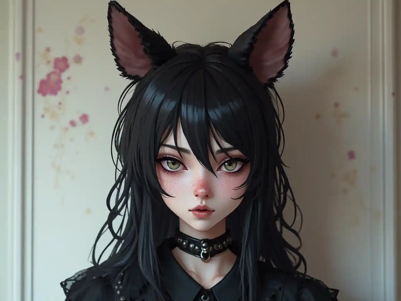 کتے کے کانوں اور منفرد Choker انداز کے ساتھ گوتھ لڑکی