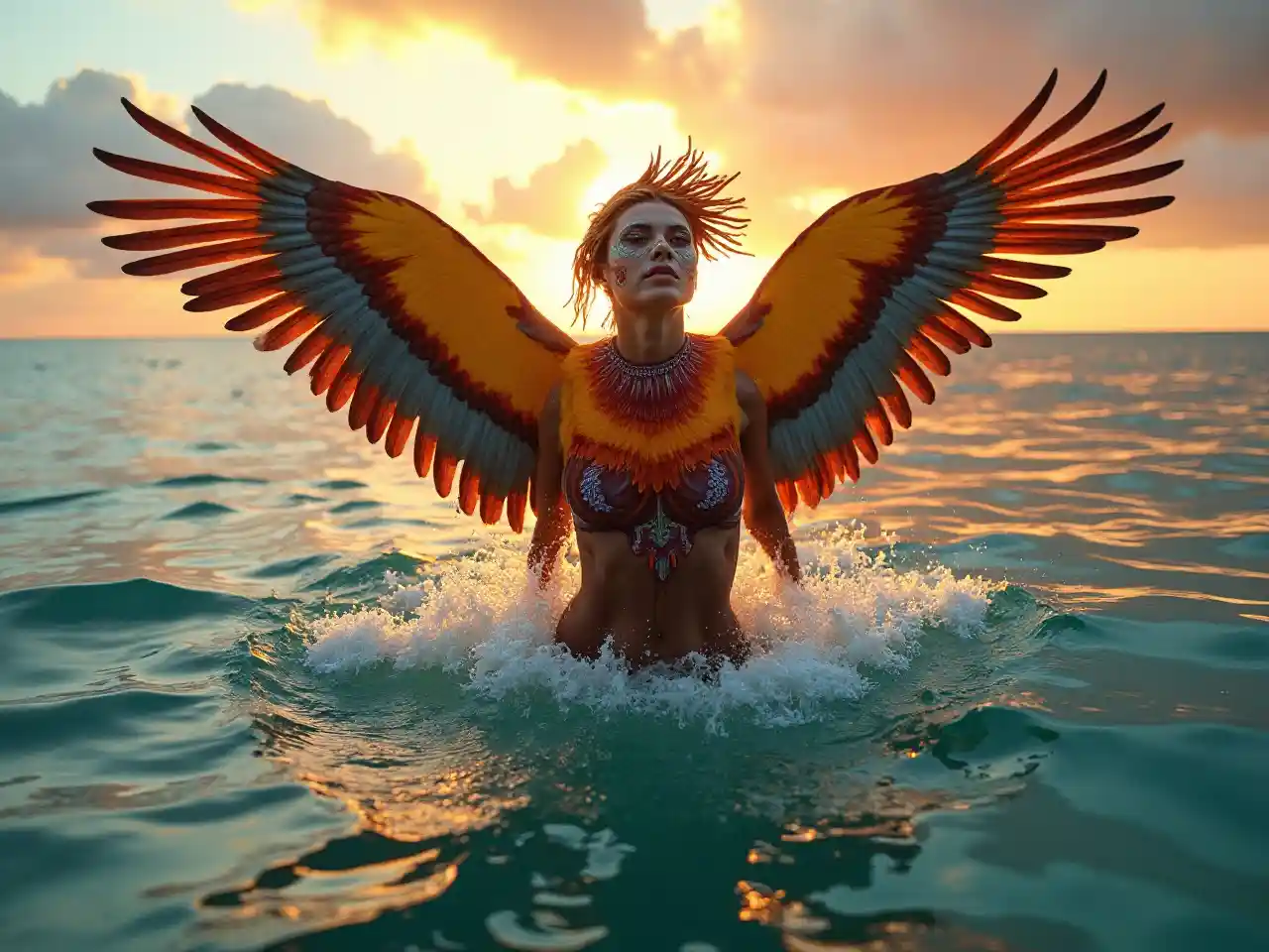سورج غروب ہوتے ہی لہروں میں سے نکلنے والی ایک شاندار شکل انسان اور پرندوں دونوں کی خصوصیات کو ظاہر کرتی ہے۔ اس کے چہرے پر پیچیدہ پینٹ لگا ہوا ہے جو سمندر اور آسمان کے رنگوں کی نقل کرتا ہے۔ سورج کے پیچھے ایک گرم سنہری چمک ہے، بادلوں کو روشن کرتی ہے اور لہروں پر عکاسی کرتی ہے، ایک غیر معمولی ماحول پیدا کرتی ہے۔ اس تصنیف میں سمندر اور آسمان کے درمیان کشیدگی کو پکڑا گیا ہے، جس میں شخصیت کی متحرک پوزیشن اور پرندوں اور انسانی شکل کے جادوگر ترکیب پر زور دیا گیا ہے. یہ غیر حقیقی منظر تبدیلی اور آزادی کے موضوعات کو اجاگر کرتا ہے، فطرت اور انسانی فن کے درمیان حدود کو دھکا دیتا ہے.