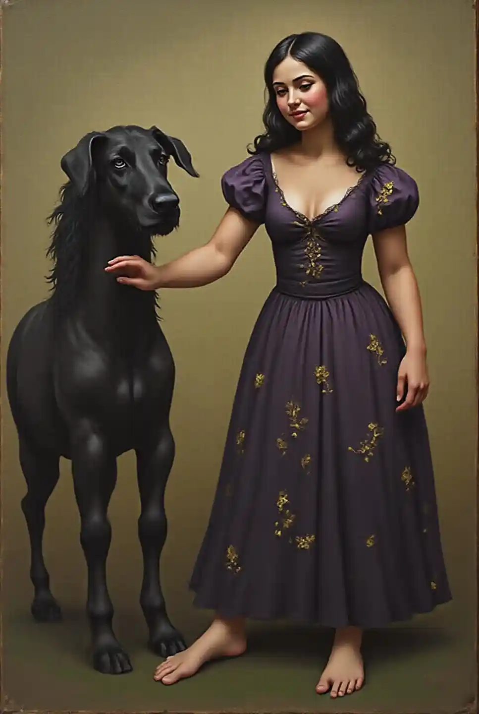 Adalynتیل کی پینٹنگ. ایک نوجوان عورت زیتون کی جلد کے ساتھ، 20-25 سال کی عمر میں ایک طویل سیاہ جامنی لباس کے ساتھ سونے کے پیٹرن، انگور اور پھولوں کی طرح، آہستہ ایک